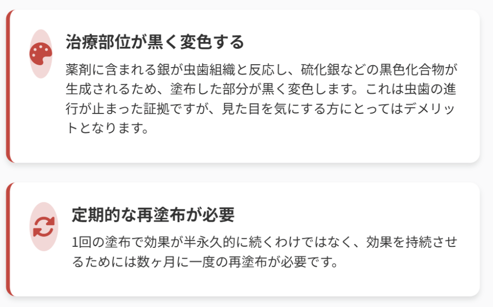 サホライドは、歯を削らずに虫歯の進行を抑えることができる非常に有効な治療法です。 黒く変色するなどのデメリットはありますが、特に小さなお子さまや治療に不安がある患者さんにとっては負担が少なく、安全性の高い選択肢のひとつです。
