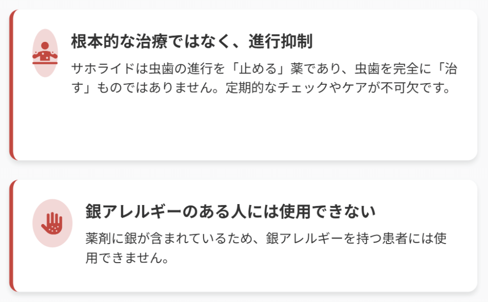 サホライドは虫歯を“完治”させる薬ではありません。 あくまで「進行を抑える薬」であり、根本的に治すには定期的なチェックが欠かせません。