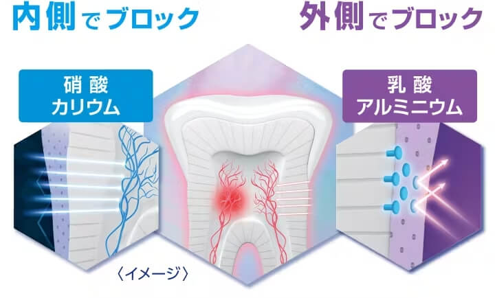 歯磨き粉の成分表示を見て、「硝酸カリウム」や「乳酸アルミニウム」が含まれているものを選んでみてください。これらの成分は神経への刺激をブロックする働きがあります。最近では、ホワイトニングや口臭予防など様々な機能がプラスされた製品もあります。