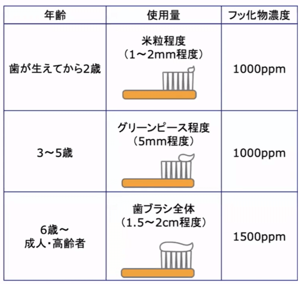 フッ化物配合歯磨剤の推奨される利用量は、次の表を参考になさって下さい。