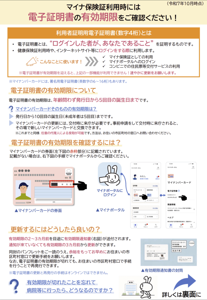 制度移行に伴い、ご不便をおかけする場面があるかもしれません。ただ、このシステム変更はより良い医療提供と安全確保のための重要な仕組みでもあります。電子証明書の有効期限をご確認のうえ、お早めの更新をお願いいたします。