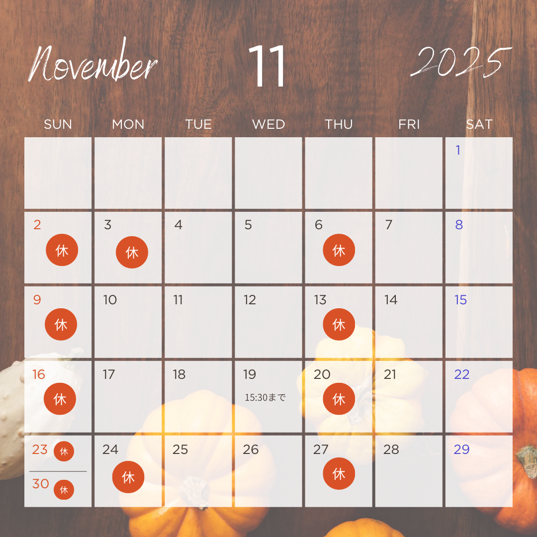 さて、誠に勝手ながら、11月の当院の休診日は下記の通りとさせていただきます。また、11月19日(水)は院内ミーティングのため、午後3時30分までの診療とさせていただきます。