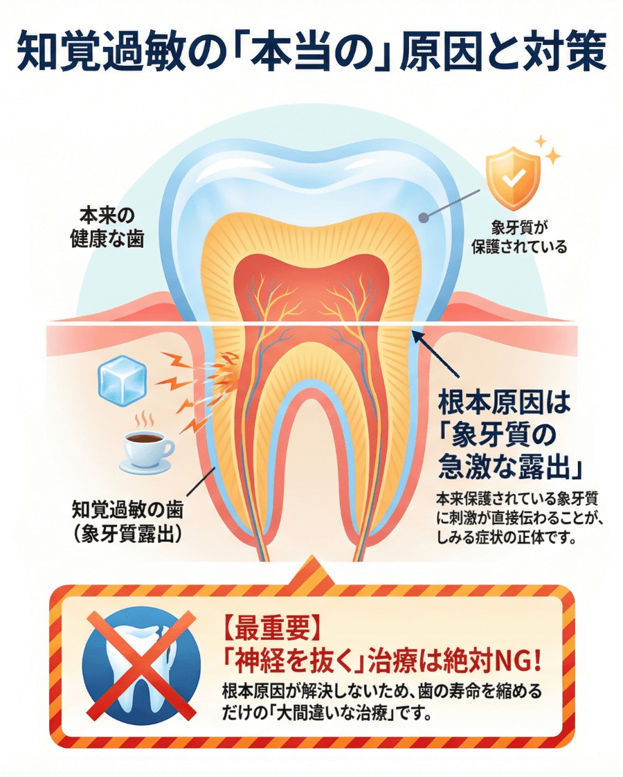 しみる原因が、知覚過敏ではなく治療が必要な「虫歯」である可能性もあります。症状が長く続く場合は、自己判断せず、必ず一度は歯科医院で診査を受けるようにしてください。