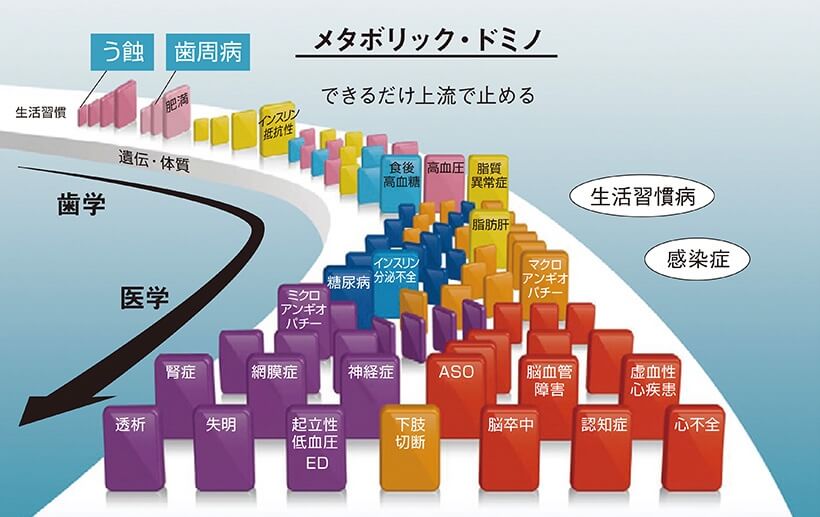 といった具合に、まさにドミノ倒しのように健康が崩れて行くと言われています。ですから、お口の健康を守ることは生活習慣病の予防にもつながると考えられているのです。